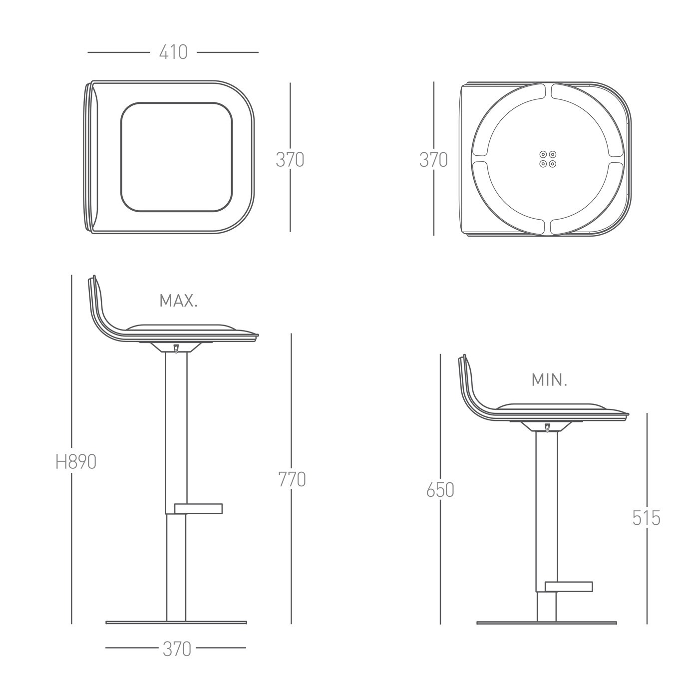| Dimensions/seat height | D 41 x W 37 x H 89 cm max./min.: 77 – 51.5 cm (continuously adjustable) | |