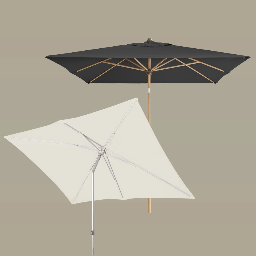 Der Sonnenschirm ‚AIR‘ ist ist in 2 Versionen erhältlich, mit einem Gestell aus silberfarbigen Aluminium und einem Gestell in Alu-Holzoptik. Aluminium hat eine lange Lebensdauer sowie eine sehr gute Korrosionsbeständigkeit, ist lichtecht, wetterbeständig, und übersteht auch Frost, Sonne, Regen und UV-Strahlung.