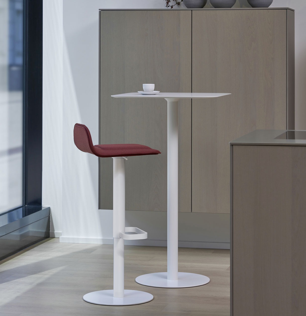 ED Barhocker von Moree, den es in 12 Sitzschale-Standfuß-Varianten gibt. Dieser ist 360 Grad dreh- und stufenlos höhenverstellbar und wird flexibel am Stehtisch und an Bars, als auch als gängige Sitzmöglichkeit genutzt. Ob ein Set ganz in cleanem, schicken Weiß oder eine Tisch-Barhocker-Kombination mit eleganten Holzdetails: mit ED 105+ ED entsteht ein einladender Platz für viele Gelegenheiten. Dabei ist der Barhocker ED in verschiedenen Farb-Holz-Kombination erhältlich. Neben den puristischen Variante in weiß-weiß und dem weiß-grauen Modell, stehen auch Sitzschalen in Weiß-Eiche und Weiß-Walnuss, bzw. Grau-Eiche und Grau-Walnuss zur Auswahl.