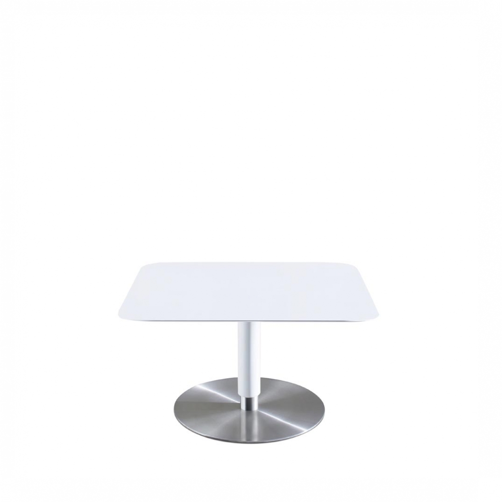 | Material/ Farbe | Tischplatte: HPL, weiß Mittelteil: Stahl pulverbeschichtet, Edelstahl gebürstet Bodenplatte: Edelstahl gebürstet | |