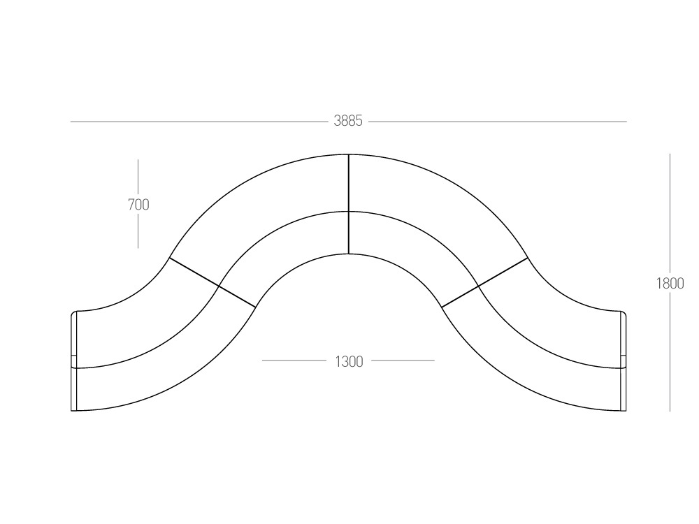| Maße | 3885 x 1800 x H 1050 mm (plus Höhe des ausgewählten Fußes oder Rades) • H 1070 mm (inkl. Füße H20mm) • H 1110 mm (inkl. Füße H60mm) • H 1110 mm (inkl. Räder H60mm) • H 1150 mm (inkl. Räder H100mm) |