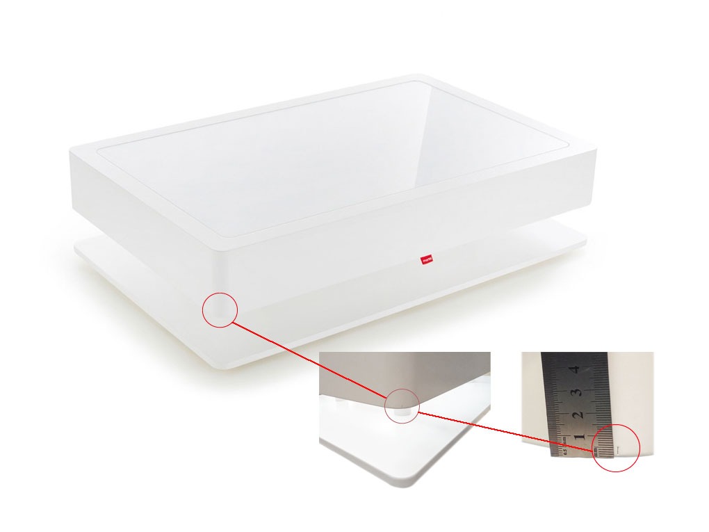 Den Couchtisch ist jetzt auch als ‚kabellose‘ Version mit Akku-Leuchteinheit erhältlich. Die Leuchteinheit wird zum Aufladen aus dem Tisch entnommen und wird dann wieder in den Tisch eingesetzt um in Weiß oder Multicolor zu leuchten. 15 voreingestellte Farben und Weiß werden per Fernbedienung gewählt und gedimmt.